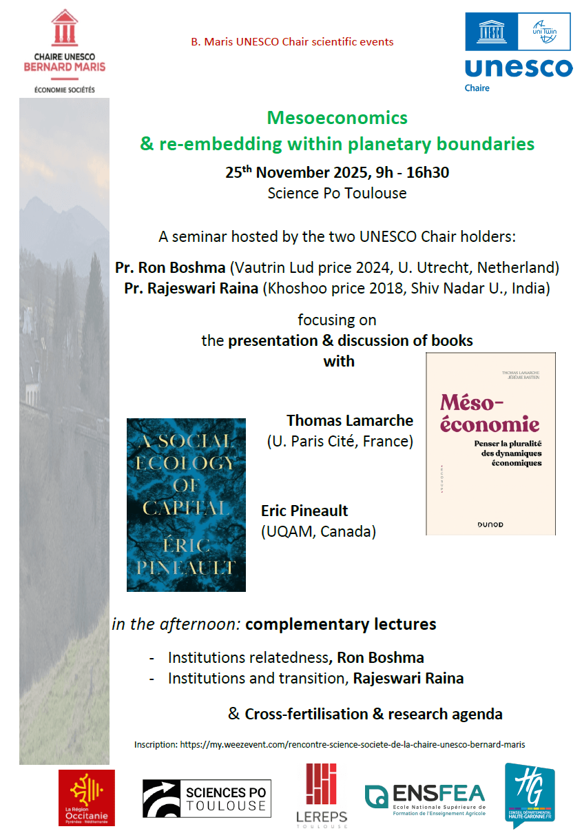 - 25 Novembre (9 a.m. to 4:30 p.m.): Key scientific event of the week: Mesoeconomics and re-embedding within planetary boundaries, based on the presentation of two books and presentations by our co-holders, and discussions on the socio-economic levers for re-embedding human activities within planetary boundaries.